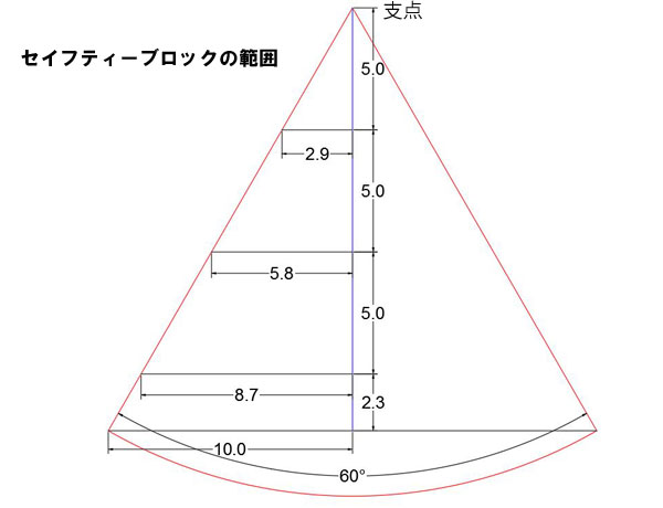 例えば、20mのセイフティーブロックで支点(セイフティーブロックを設置した所)から5m下がった所では、