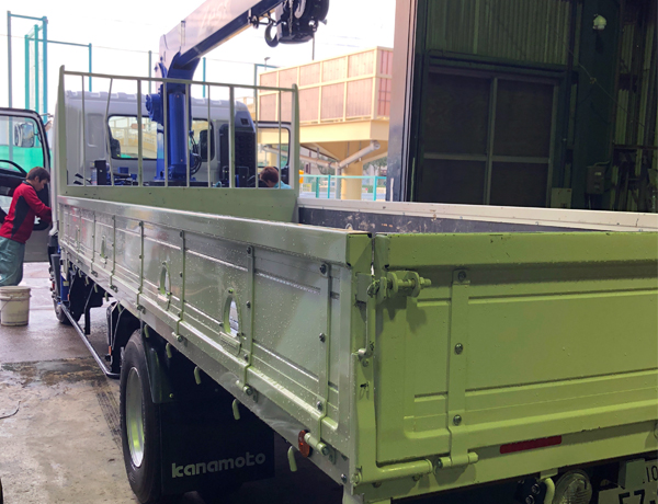 すると、もの凄く汚れたリースの4tトラックを社員が洗車していました。