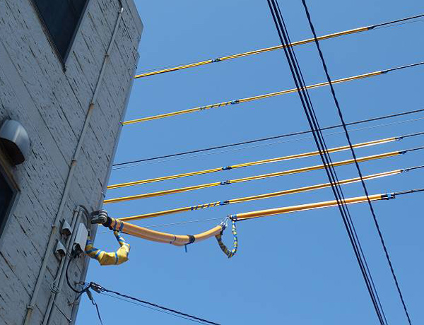 送電線付近での施工は十分に注意喚起を行い、視覚的に常に気になるような看板やロープなどを張って