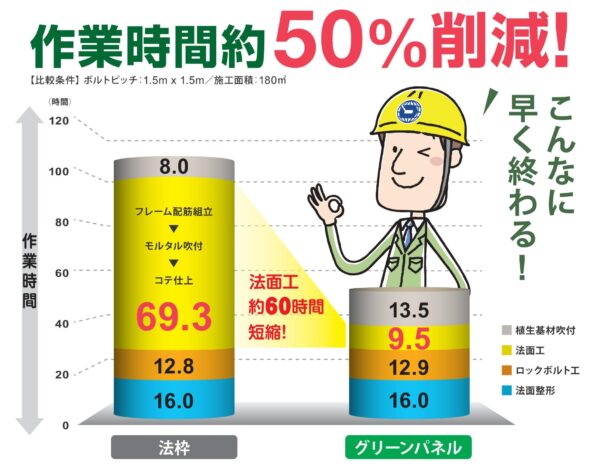 法枠と比べて工程数が少なく、熟練度も必要としないので、工期が約半分に削減でき、省力化ができます